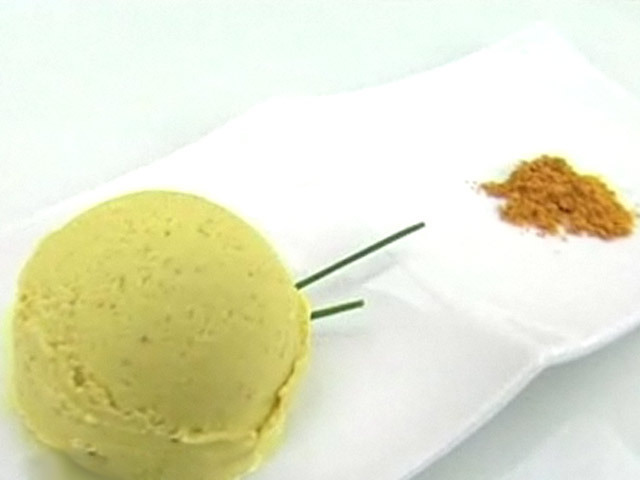Рецепт легкого мороженого с карри.Состав:карри — 1 столовая ложка;сливки — 2 стакана;яичные желтки — 6 штук;соль, перец.